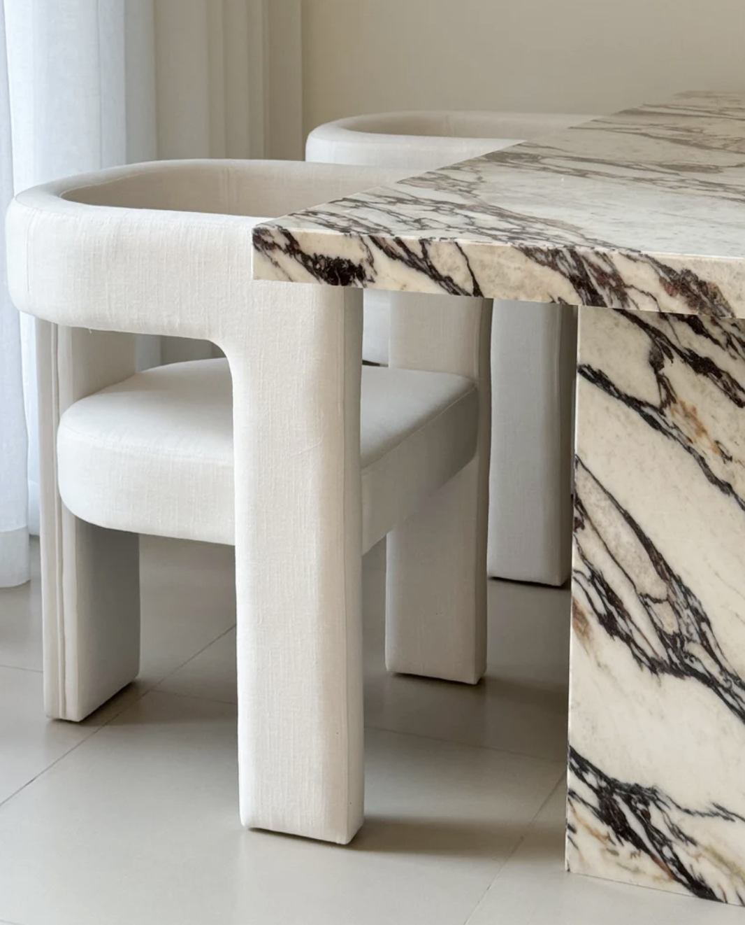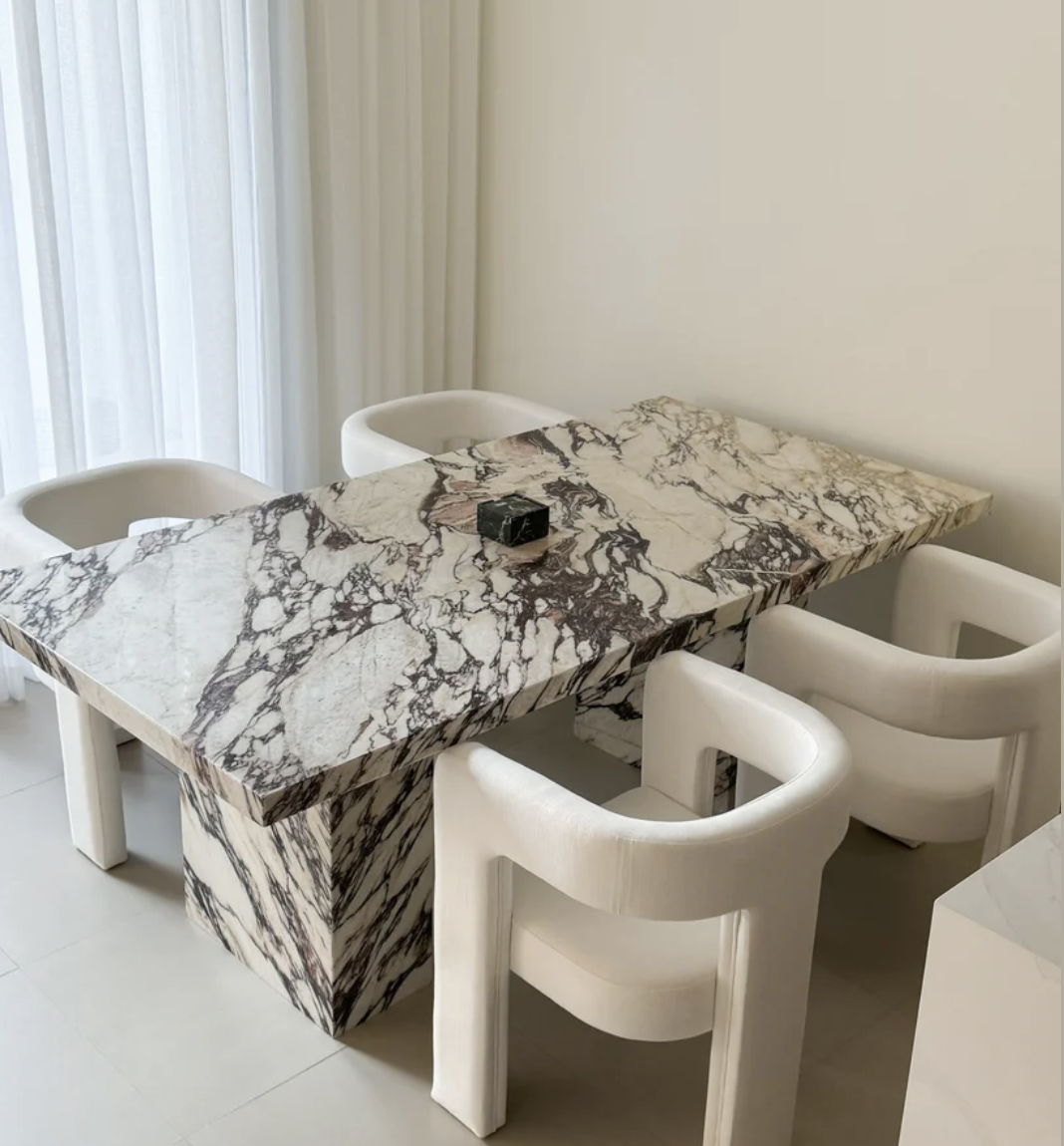 Supported by two sculpted solid marble legs, the table exudes stability and style. The seamless design of the legs complements the unique veining of the top, creating a harmonious and refined look. Ideal for those who appreciate high-end craftsmanship and timeless beauty, the Stoney Marble Dining Table is a statement piece that will elevate any dining experience.