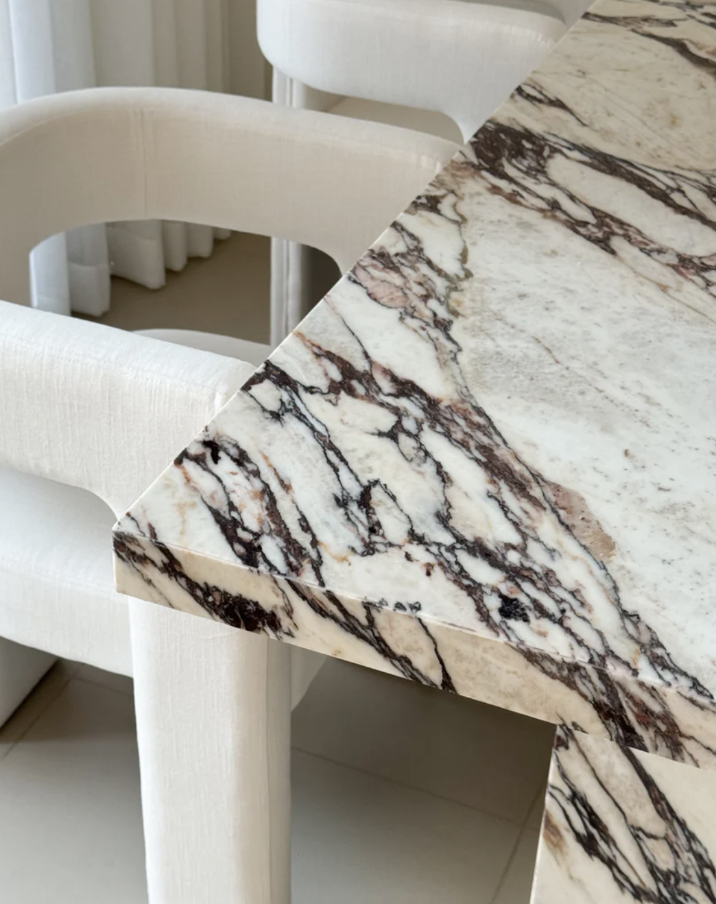 The Stoney Dining Table showcases the natural beauty of Calacatta Viola marble, renowned for its striking veining and luxurious appearance. The solid marble top is a true work of art, with intricate veining that adds depth and sophistication to any dining space. Its polished finish enhances the marble’s inherent elegance, making it a standout piece in both modern and traditional interiors.